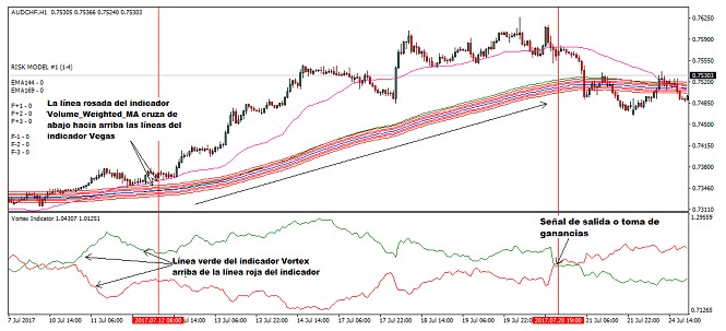 Para retirar ganancias, si el precio cierra arriba de las líneas del indicador Vegas, esta es una señal de que la tendencia bajista está perdiendo fuerza y, por lo tanto, una señal para salir o cerrar con ganancias al mismo tiempo.
