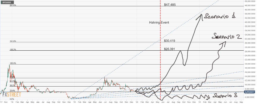 El primer escenario es alcista completo . En este modelo, el par BTC / USD sigue la tradición y surge una fuerte tendencia alcista desde los primeros días del año. Llegaría a la zona de los máximos históricos coincidiendo con el evento de Reducción a la mitad y continuaría en dirección al destino favorito de todos los acuñadores, ¡la Luna!