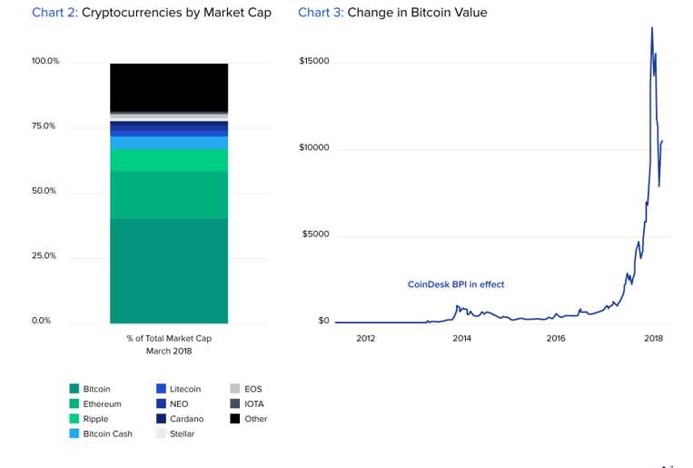 Según los expertos de la industria, "no habrá una moneda digital suprema ... Se está afianzando una especie de criptopluralismo". Aunque Bitcoin y Ethereum comprenden la mayor parte de la cuota de mercado de las criptomonedas (consulte el Gráfico 2 a continuación), hemos visto la aparición y el rápido crecimiento de muchas tecnologías nuevas. De hecho, actualmente existen más de 1.000 criptomonedas (llamadas "altcoins"); más de 600 tienen capitalizaciones de mercado de más de $ 100,000.
