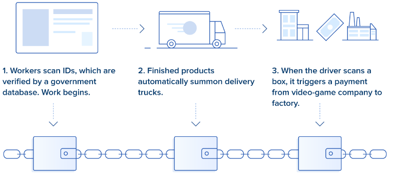 Sin embargo, combinados con blockchain, los contratos inteligentes proporcionan una responsabilidad automatizada. Los contratos inteligentes se pueden aprovechar de varias maneras: cuando un camión recoge las consolas fabricadas en la fábrica, la empresa de transporte escanea las cajas. Luego se agregan a la cadena de bloques, lo que desencadena una liberación de fondos de la cuenta de la compañía de videojuegos. No hay factura ni seguimiento de pagos. Más allá de los pagos, un trabajador determinado en producción podría escanear su tarjeta de identificación, que luego es verificada por fuentes externas para asegurarse de que no viola las políticas laborales.