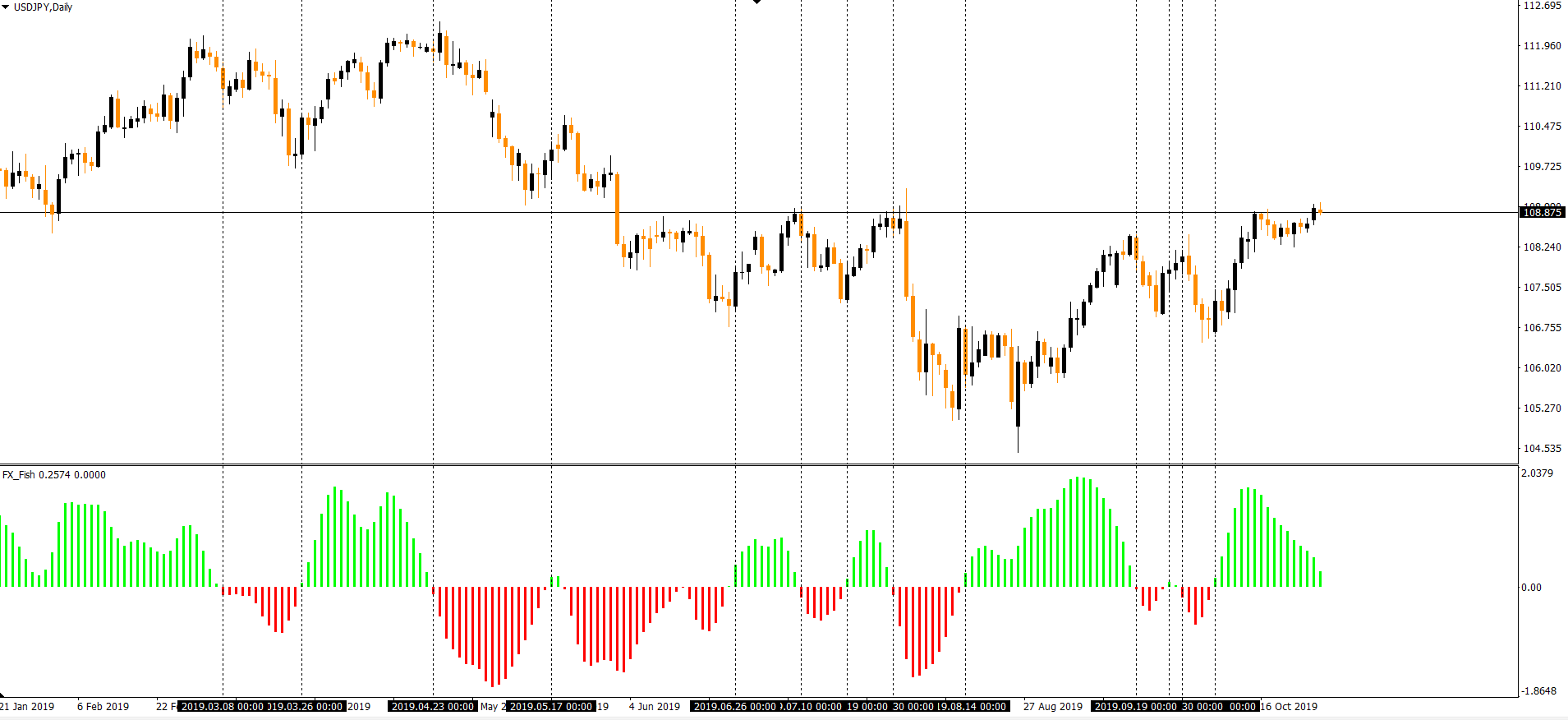 El término significa Forex Fish Indicator. Se considera como uno de los indicadores más poderosos para MetaTrader 4. Es un poderoso indicador de oscilador que da una señal precisa de negociación. Según la condición desesperada del mercado, traza las barras de color verde y rojo. El color se puede cambiar simplemente pasando por la configuración de este indicador. También es poderoso porque detecta las irregularidades en la barra de precios que no se pueden ver fácilmente a simple vista. También puede cambiar los datos almacenados. Al usar esto, un comerciante puede cambiar la estrategia de acuerdo con la variación de la barra de precios.