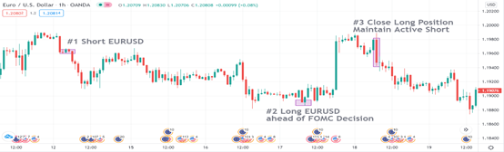Sin embargo, también sabemos que el día 17 hubo una decisión del FOMC, y nunca es una buena idea mantener una gran posición abierta cuando el banco central de una de las divisas implicadas está a punto de anunciar una decisión. Por lo tanto, con la posibilidad de ir en largo y en corto en el EUR/USD, podríamos comprar 100.000 EURUSD en una caída durante la operación de Londres, compensando efectivamente nuestra posición corta anterior y asegurando una ganancia de aproximadamente 67 pips.