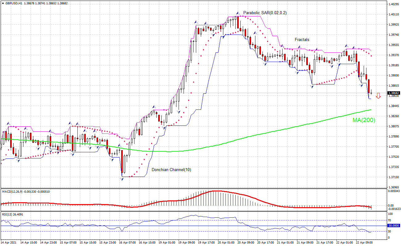El análisis técnico del GBPUSD del gráfico de precios en el marco de tiempo de 1 hora muestra que el GBPUSD: H1 está cayendo hacia el promedio móvil de 200 períodos MA (200) que sigue aumentando. Creemos que el movimiento bajista continuará después de que el precio se rompa por debajo del límite inferior del canal de Donchian en 1.3858. Un nivel por debajo de este se puede utilizar como punto de entrada para colocar una orden pendiente de venta. El stop loss se puede colocar por encima de 1.3945. Después de realizar la orden, el stop loss se moverá al siguiente indicador fractal alto, siguiendo las señales parabólicas. Por lo tanto, estamos cambiando la relación de pérdidas / ganancias esperada al punto de equilibrio. Si el precio alcanza el nivel de stop loss sin llegar a la orden, recomendamos cancelar la orden: el mercado ha sufrido cambios internos que no se tuvieron en cuenta.
