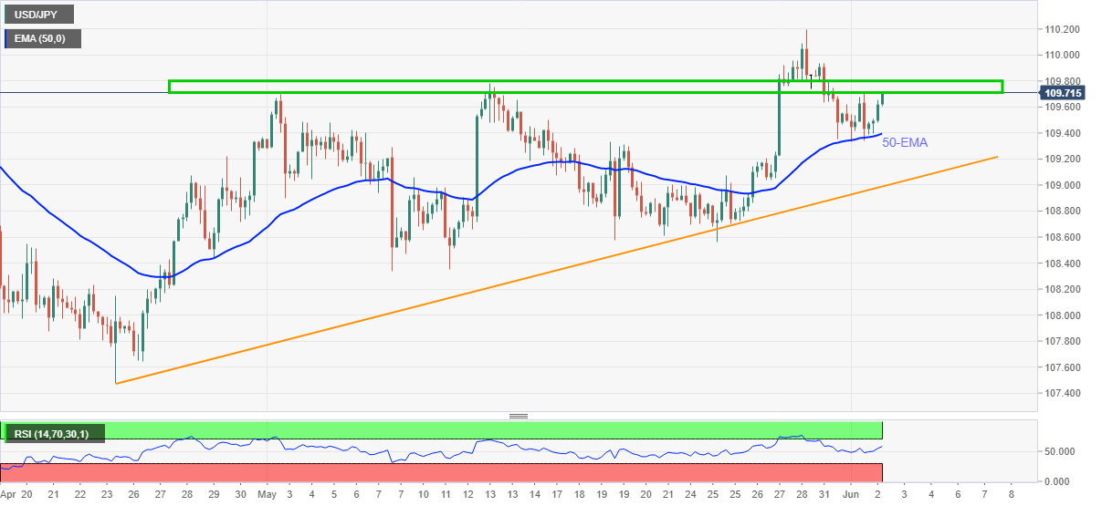 El USD / JPY lleva las ofertas cerca de 109.70, un alza de 0.20% intradía, ya que el par extiende el rebote desde 50-EMA durante la madrugada del miércoles.