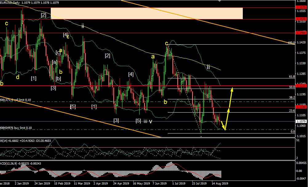Desde un punto de vista técnico, la situación no ha cambiado. El gráfico diario presentado ayer mostró una desaceleración en la banda inferior del sobre. Ahora deberíamos centrar la atención en 1.1045. No debe desglosarse, de lo contrario podemos olvidarnos de la tendencia alcista nuevamente. El nivel de 1.1140 fortalecerá la tendencia alcista con el objetivo de 1.1240. El escenario de onda supone otro rebote al alza a 1.1265 sin alcanzar nuevos mínimos en la onda C.