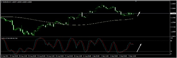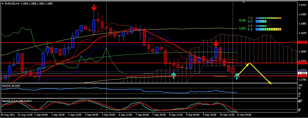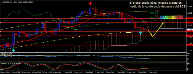 Nube Ichimoku en el gráfico de cuatro horas y el borde inferior de las bandas TMA, es decir, 1,1808.