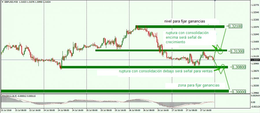 La ruptura del nivel 1.3080 por 30 puntos y la consolidación del precio debajo de este nivel. En este caso, el nivel para fijar ganancias estará en 1.3000.