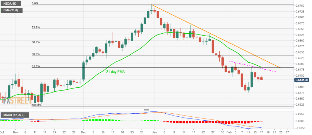 Mientras tanto, un espacio libre al alza de resistencia 0.6480 / 85 confluencia de podría desencadenar una nueva recuperación apuntando a una línea de tendencia descendente desde el 31 de diciembre de 2019, en 0.6525 ahora.