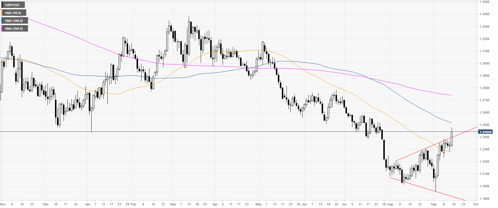 La Libra cotiza en una tendencia bajista por debajo de los promedios móviles simples (SMA) de 100 y 200 días. Sin embargo, el mercado se ha recuperado en agosto y septiembre en lo que puede ser una formación de triángulo en expansión.