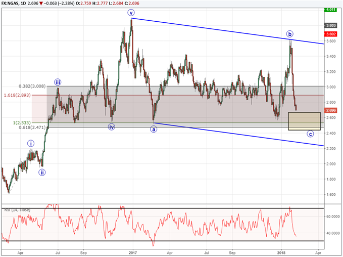 En septiembre de 2017, escribimos que una caída hacia 2.60 podría ofrecer a los toros de Nat Gas la oportunidad de establecer posiciones largas. Los precios de Nat Gas se han estado vendiendo mucho y creemos que esto puede ser un lavado antes de abrir la puerta para los toros.