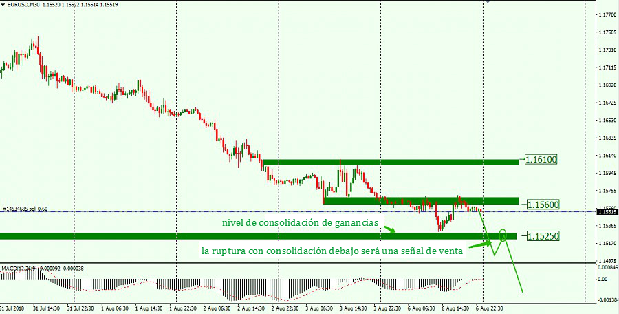 Si el precio se mueve en la dirección bajista, podemos esperar una ruptura y consolidación del precio debajo de 1.1525. Esta será una señal de venta.