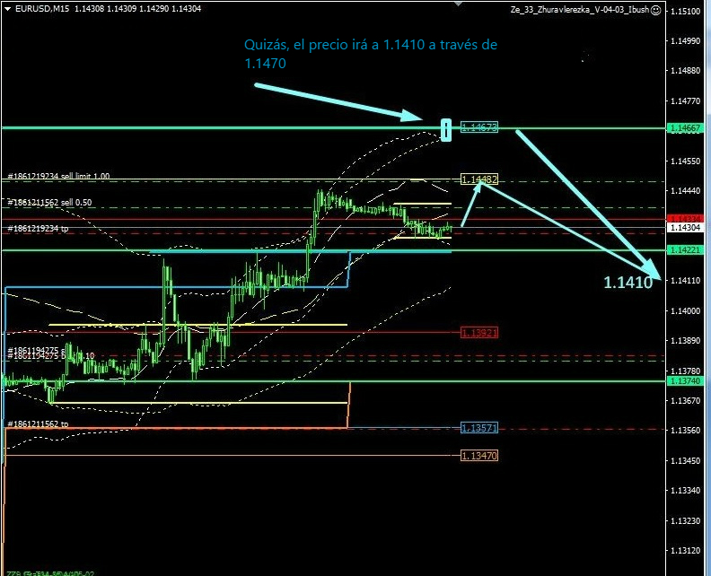 ¡Hola especuladores! Aquí está mi pronóstico para el comercio intradía. El gráfico de 15 minutos sugiere la estrategia de compra. El nivel objetivo es 1.1450 y quizás 1.1470. Una señal de compra intradía podría cancelarse y el nivel de 1.1410 podría romperse. Ahora observemos los detalles. Toda la tendencia va a sur. En la actualidad, he dibujado la señal para retroceso desde la tendencia al sur. Espero el norte al alza hasta 1.1450. Dudo de un movimiento alcista, aunque no lo descarto. Lo dudo porque estos niveles podrían ser rechazados. Por otra parte, no espero un sesgo bajista después del rechazo de los niveles superiores. Los niveles menores para hoy son 1.1410 y 1.1390. Tengo planes simples en el comercio intradía para hoy. Voy a vender al alza con el nivel objetivo de 1.1420. Desde los niveles menores, voy a comprar. Hoy, las operaciones largas tienen sentido solo en la noche. Es muy pronto para discutirlo, pero debemos tener esto en cuenta. Estos son mis planes para el comercio intradía hoy.