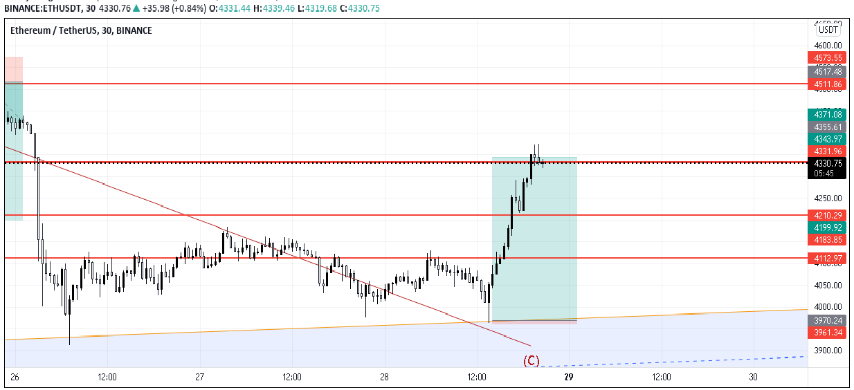 Como estan queridos colegas, el Ether ( ETH ) superó la EMA de 20 días ($ 4,336 dolares) el 25 de noviembre, pero el movimiento alcista resultó ser una trampa alcista, ya que el precio bajó bruscamente el 26 de noviembre y cayó al cuello de la cabeza y los hombros en desarrollo. (H&S) patrón.