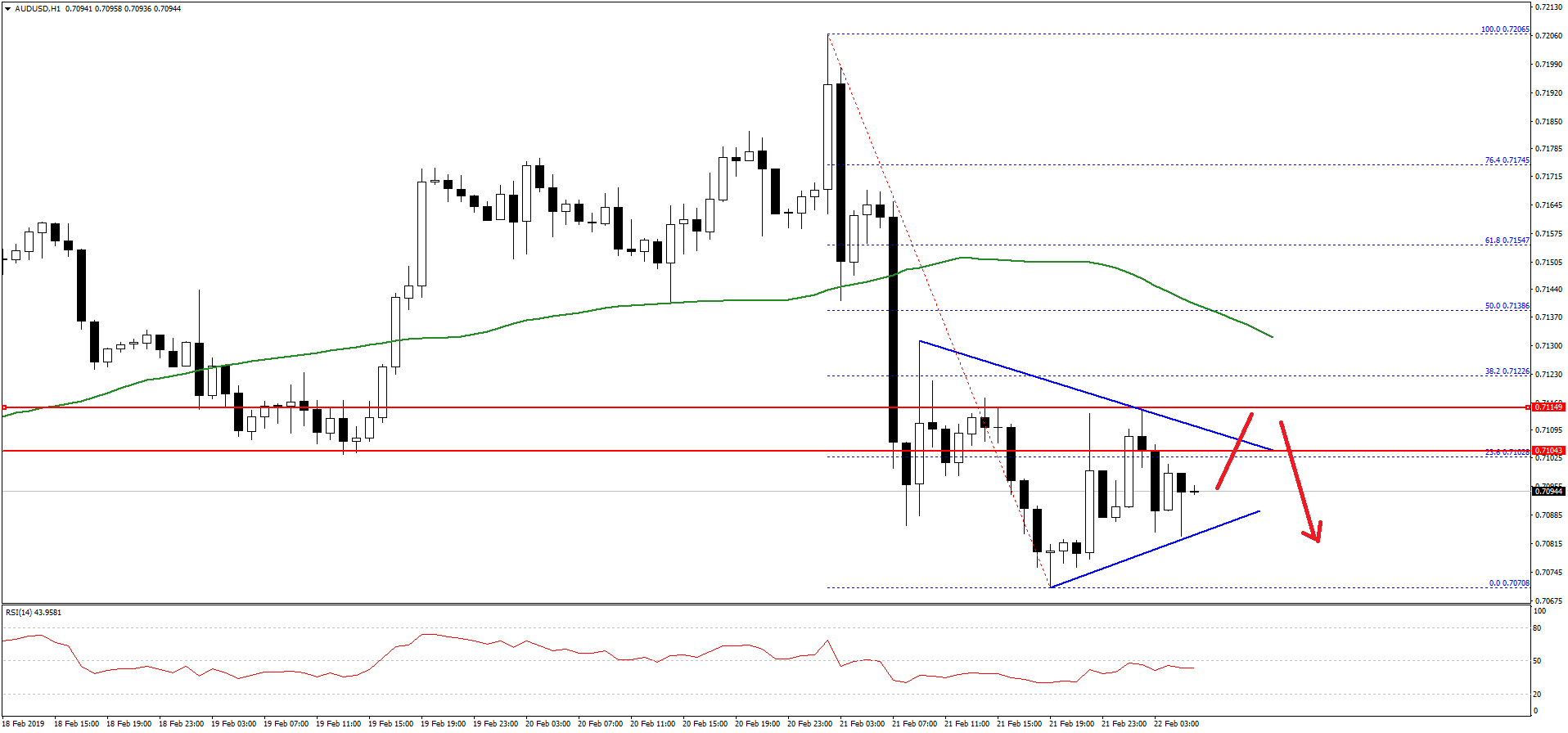 El par actualmente está corrigiendo más alto y se está negociando dentro de un triángulo que se contrae con resistencia cerca del 0.7105 en el gráfico horario . Además, existe una fuerte resistencia cerca del nivel de 0.7115 y el nivel de retroceso de Fib del 38.2% de la reciente disminución desde el máximo de 0.7206 hasta el mínimo de 0.7070.