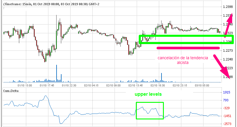 Según el delta, podemos ver el rango del comprador: 1.2264-1.2290. Aquí buscaré condiciones para abrir compras.