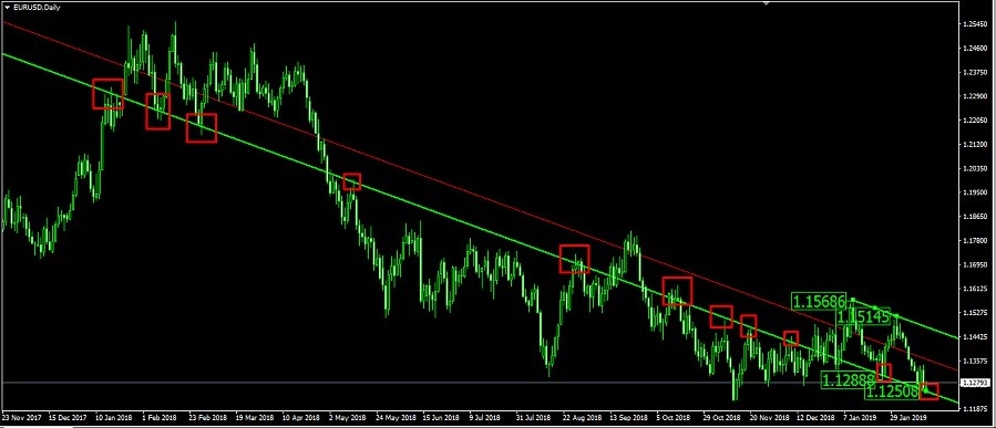 Luego, simplemente cambié el marco de tiempo y quedó claro que el año pasado, el precio se ajustó estrictamente a esta línea de tendencia en particular.