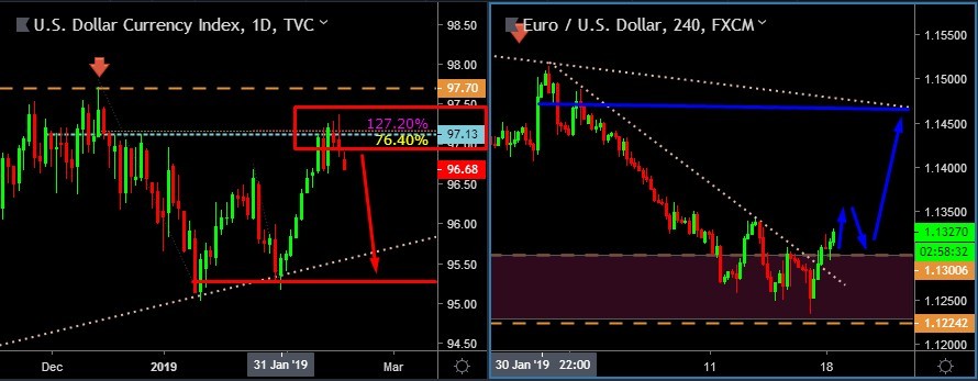 La semana pasada hablamos acerca de cómo se esperaba el USD ($ DXY) para un retroceso. Vimos los niveles exactos en torno al 97.10 / 1272 $ / 76.4% y después de una larga batalla, los osos tomaron el control, abrimos esta semana con una brecha a la baja y ahora seguimos operando a la baja. ¡Esto es genial para nuestro oro largo de la semana pasada!