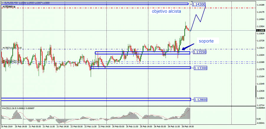 El par EUR/USD ayer cerró al alza por segunda sesión consecutiva esta semana. Si bien la mayoría de las horas de mercado asiáticas y europeas experimentaron una acción de precios relativamente apagada, las señales positivas en las horas de mercado europeas y asiáticas llevaron a que el par rompiera el nivel de 1,14 una vez más, pero el repunte por encima de dicho nivel fue breve, ya que el EUR carecía de fuerza para seguir presionando al alza o mantener un rally estable por encima de 1,1400. En Estados Unidos tuvimos datos mixtos y el presidente de la Fed, Jerome Powell, reafirmó la postura moderada de la Fed durante su discurso ante el Comité bancario del Senado de Estados Unidos, declarando que los eventos recientes han resultado en una señal conflictiva y que los miembros del FOMC han decidido adoptar un enfoque “paciente”.