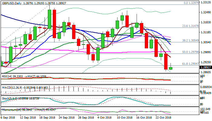 La modesta recuperación del nuevo mínimo de siete semanas en 1.2867 (mínimo del miércoles) alcanzó un máximo de 1.2919 al inicio de la sesión del jueves, y los osos tomaron un respiro después de que la PM del Reino Unido, May, recibió el apoyo de su partido, a pesar de los tonos disonantes que venían de la oposición recientemente. partido. La obtención de beneficios después de la caída del 0,8% del miércoles, que también generó fuertes señales negativas en los soportes pivotales cercanos a 1.2921 (anteriormente la base más alta) y 1.2904 (Fibo 61.8% de 1.2661 / 1.3297), es probable que preceda a una nueva debilidad, como se muestra en general osuno. Impulso bajista creciente y múltiples cruces de oso de MA diarios en un escenario de soporte de configuración totalmente bajista. Hasta ahora, la recuperación fue incapaz de superar la resistencia inicial en 1.2921, y se espera que los repuntes prolongados se estancen bajo una fuerte resistencia de 1.30zona (base de nubes diaria / 55SMA rota / barrera psicológica) para mantener el sesgo bajista. Los osos frescos podrían estirarse hacia los soportes en 1.2811 (Fibo 76.4%) y 1.2785 (mínimo de 5 de septiembre).