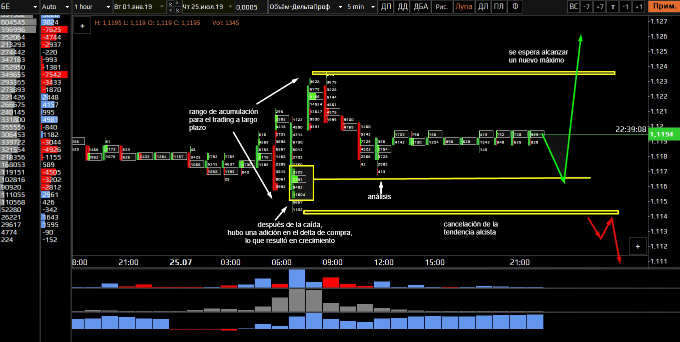 De acuerdo con la tabla de futuros con volúmenes y delta, podemos definir el rango de una gran adición.