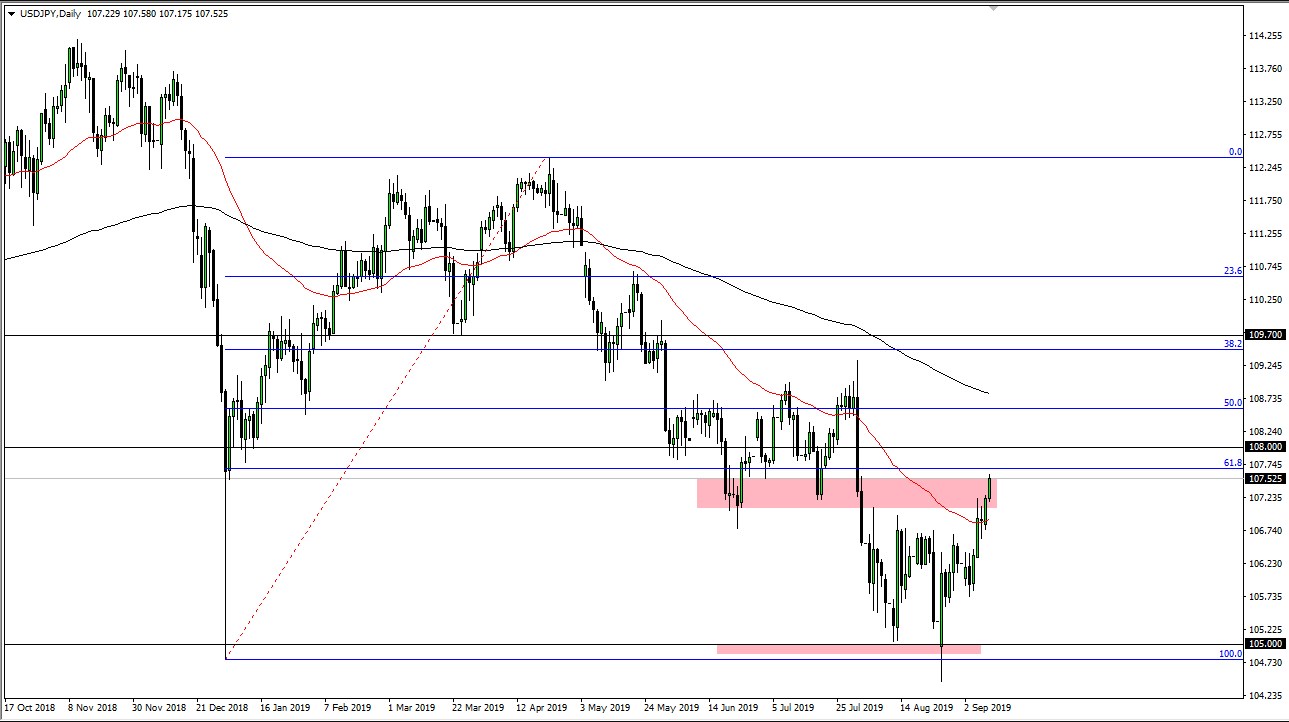 El Dólar Estadounidense ha retrocedido inicialmente durante la sesión de operaciones del jueves, alcanzando la parte inferior de la sesión del miércoles, antes de rebotar y quebrar por encima del nivel de ¥108. En este punto, ahora que estamos arriba, es probable que sigamos subiendo, tal vez tratando de apagar la enorme vela negativa que inició el gran movimiento hacia el lado negativo. En este punto, es muy probable que el retroceso tenga la oportunidad de ofrecer valor para las personas que quieren ir a largo plazo de este mercado.