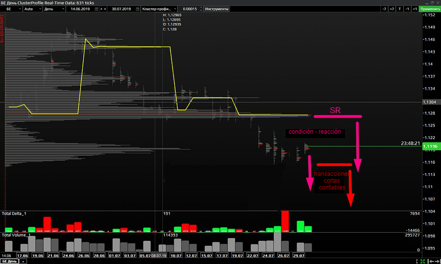 En cuanto al contrato, hay una plataforma, desde donde ha comenzado una tendencia a la baja pronunciada. Su rango es estrecho, de 1.1200 a 1.1230. También hubo una rotación máxima en este rango. Además, este es el sitio más bajo. Es decir, este rango actúa como SR para el comercio a mediano plazo. Esto significa que el movimiento por encima de 1.1230 cancelará la tendencia a la baja en el mediano plazo.