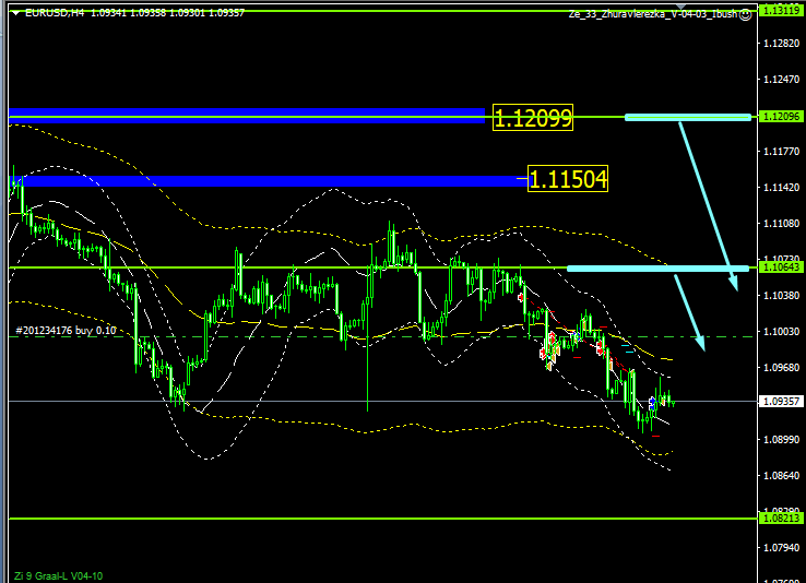 Ahora veamos qué muestra el sistema y en qué niveles se espera que la tendencia bajista se rompa. La ruptura de la tendencia bajista no significa una reversión. Es solo un gran retroceso. Las reversiones generalmente tienen lugar en el marco de tiempo diario. Entonces, comencemos con D1. Está dirigido hacia la baja, esa es la tendencia general. El plazo diario se romperá en el nivel de 1.1200, y aunque estamos por debajo, la tendencia sigue a la baja. Н4 se dirige hacia abajo. Por lo general, se muestra cuando comienza un gran retroceso. El comienzo del retroceso se confirmará en el nivel de 1.1070. Después de cada confirmación de la tendencia alcista, siempre hacemos un zigzag hacia la baja. Esto muestra el estado de ánimo entre osos y toros.