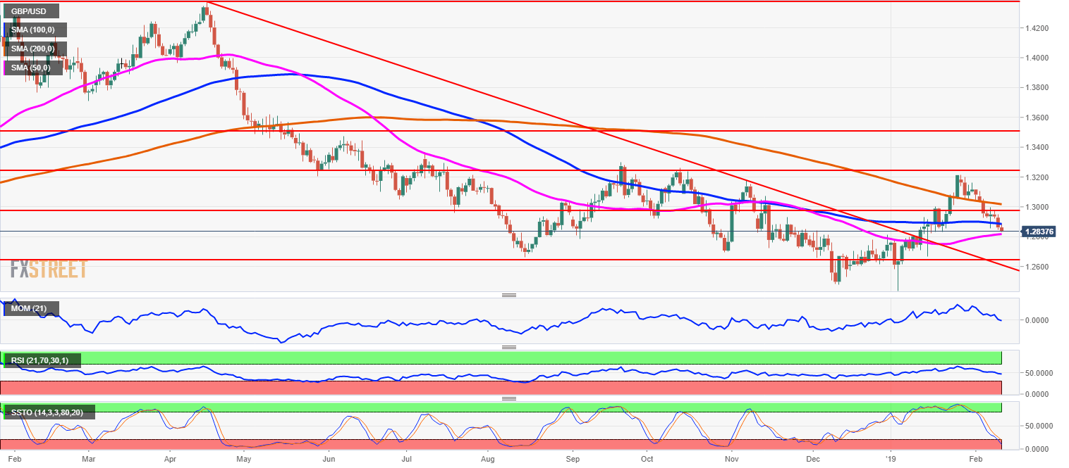 Los osciladores técnicos, como el Índice de Fuerza Relativa (RSI) y el Estocástico Lento (SS), apuntan hacia abajo, mientras que el Estocástico Lento hace un cruce bajista en el territorio de sobrecompra que indica futuros descensos de precios. Con la ruptura por debajo de 1.2850, el GBP/USD ahora apunta a un nivel de 1.28000 que representa un 50-DMA en un gráfico diario. Por el lado positivo, se espera que los 1.2900 y luego los 1.2970 se mantengan como una línea de resistencia.