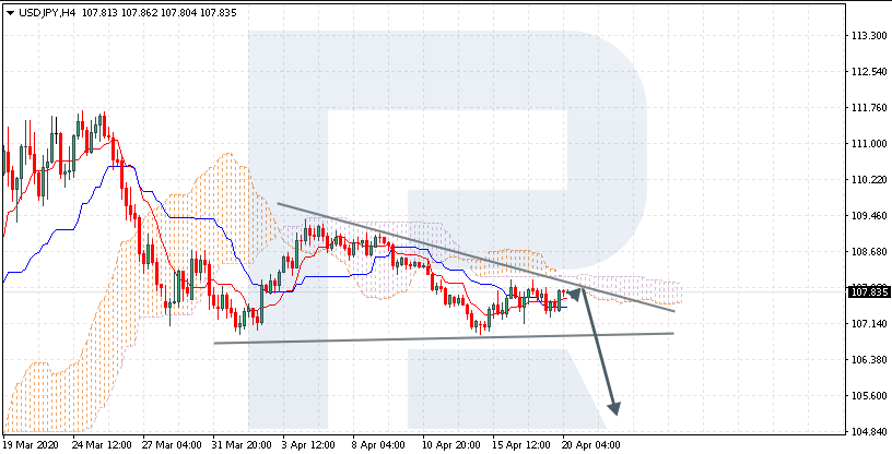 USD / JPY: Se cotiza a 107.83; el instrumento se mueve debajo de la nube Ichimoku, lo que indica una tendencia descendente. Los mercados podrían indicar que el precio puede probar la frontera a la baja de la nube en 108.05 y luego continuar moviéndose hacia abajo para llegar a 104.85. Otra señal para confirmar un mayor movimiento descendente es el rebote del precio desde el borde al alza de un patrón Triángulo. Sin embargo, el escenario que implica una mayor disminución puede cancelarse si el precio rompe el límite al alza de la nube y se fija por encima de 108.75. En este caso, el par puede continuar creciendo hacia 109.55. Después de romper el borde inferior del patrón Triángulo y fijarlo por debajo de 106.25, el precio puede continuar moviéndose hacia abajo.