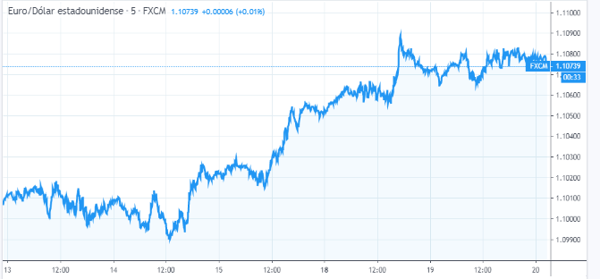 El Euro se negoció a las 18:36 horas a 1,109 dólares, lo cual supuso una subida del 0,12% frente a los 1,107 dólares del día anterior.
