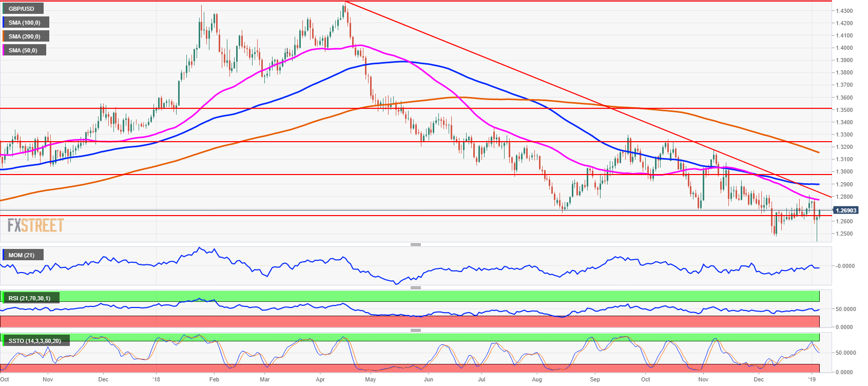 Técnicamente, el GBP/USD está operando en una tendencia descendente a la baja en un gráfico diario. Los osciladores técnicos, incluidos Momentum y el índice de Fuerza Relativa, se volvieron de plano a superior, con Sterling retirándose de un nuevo mínimo de 21 meses y el Estocástico Lento hizo un cruce bajista dentro de un territorio neutral. El GBP/USD rebotó en un promedio móvil de 50 días y con un desplome repentino cayó tan bajo como 1.2438. Con el GBP/USD retomando la tendencia lateral, una recuperación a corto plazo de 1.2700 y superior no es suficiente para revertir la tendencia. Con la incertidumbre del acuerdo de Brexit que pesa sobre la libra esterlina, todavía existe una presión fundamental para que el GBP/USD caiga aún más hacia el nivel de 1.2500-1.2440.