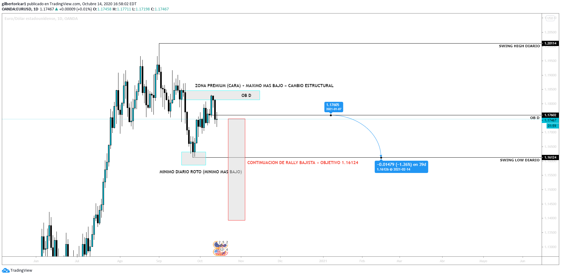 TENEMOS UN EUR/USD EN PLENO RALLY BAJISTA ,CON UNA ESTRUCTURA ALCISTA ROTA Y EN ZONA PREMIUM(CARA). YA LOS COMPRADORES SOLTANDO SUS ORDENES Y HACIENDO QUE EL PRECIO SE CAIGA DEJANDO UN VACIO DE LIQUIDES BASTANTE SIGNIFICATIVO. ESPERO QUE EL PRECIO CREE UN MINIMO MAS BAJO NUEVO PARA EMPEZAR A BUSCAR COMPRAR EN TERMINOS SWING, PERO HASTA EL MOMENTO TRADERS SWING E INTRADAY BUSCANDO VENTAS HASTA EL PRECIO DE 1.16124 CON OBJETIVOS HASTA ESE MINIMO EN DIARIO. ES EL MOMENTO PERFECTO DE POSICIONARSE EN VENTA CON BUENAS OPORTUNIDADES. TODOS LOS INSTITUCIONALES SOLTANDO SUS COMPRAS Y UN EUR/USD QUE HA CAIDO EN LA SEMANA UN 0.16% QUE SABEMOS PODRA SER MUCHO MAS CON UN CIERRE APROXIMADO DEL 0.38% O UN POCO MAS ES CUESTION DE TIEMPO Y VER COMO SE COMPORTA EL PRECIO PERO HASTA HORA TENEMOS ESO.... :1f601::1f601::1f60c::1f60c::1f600::1f600: