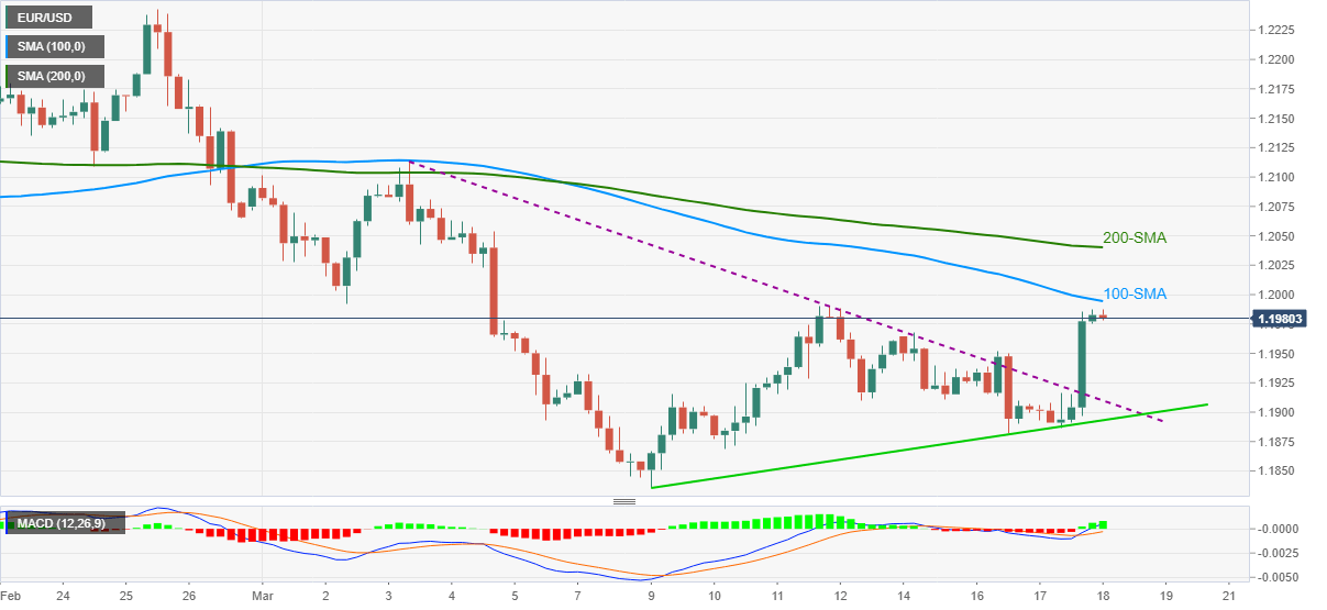 EUR / USD oscila alrededor del techo semanal, actualmente subiendo un 0,05% cerca de 1,1985, durante la madrugada del jueves. Al hacerlo, la divisa principal mantiene la ruptura del día anterior de una línea de tendencia descendente desde el 3 de marzo, respaldada por la moderada Fed .