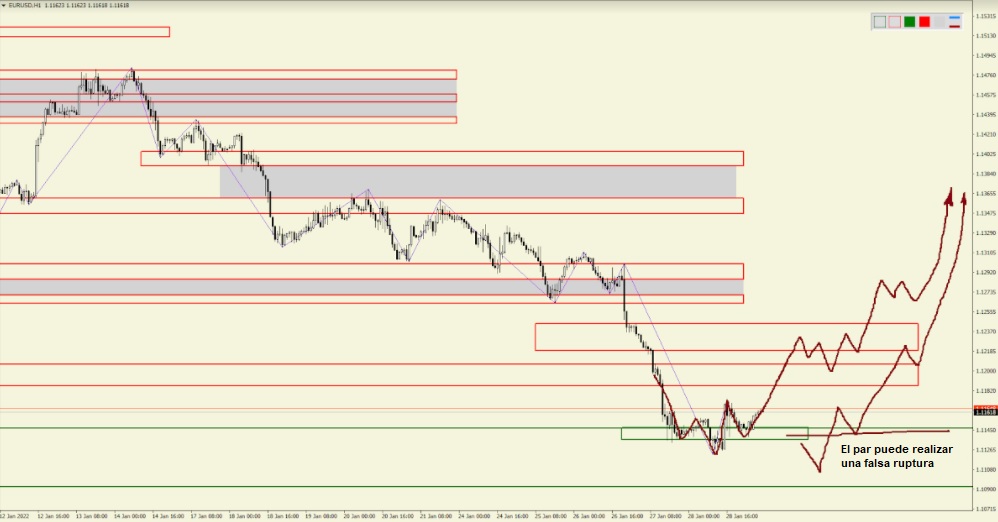desde el nivel actual y alcanzar los objetivos mediante la formación de un rango de negociación. El segundo escenario considera que el par puede realizar una ruptura falsa hacia el área de 1,1000.
