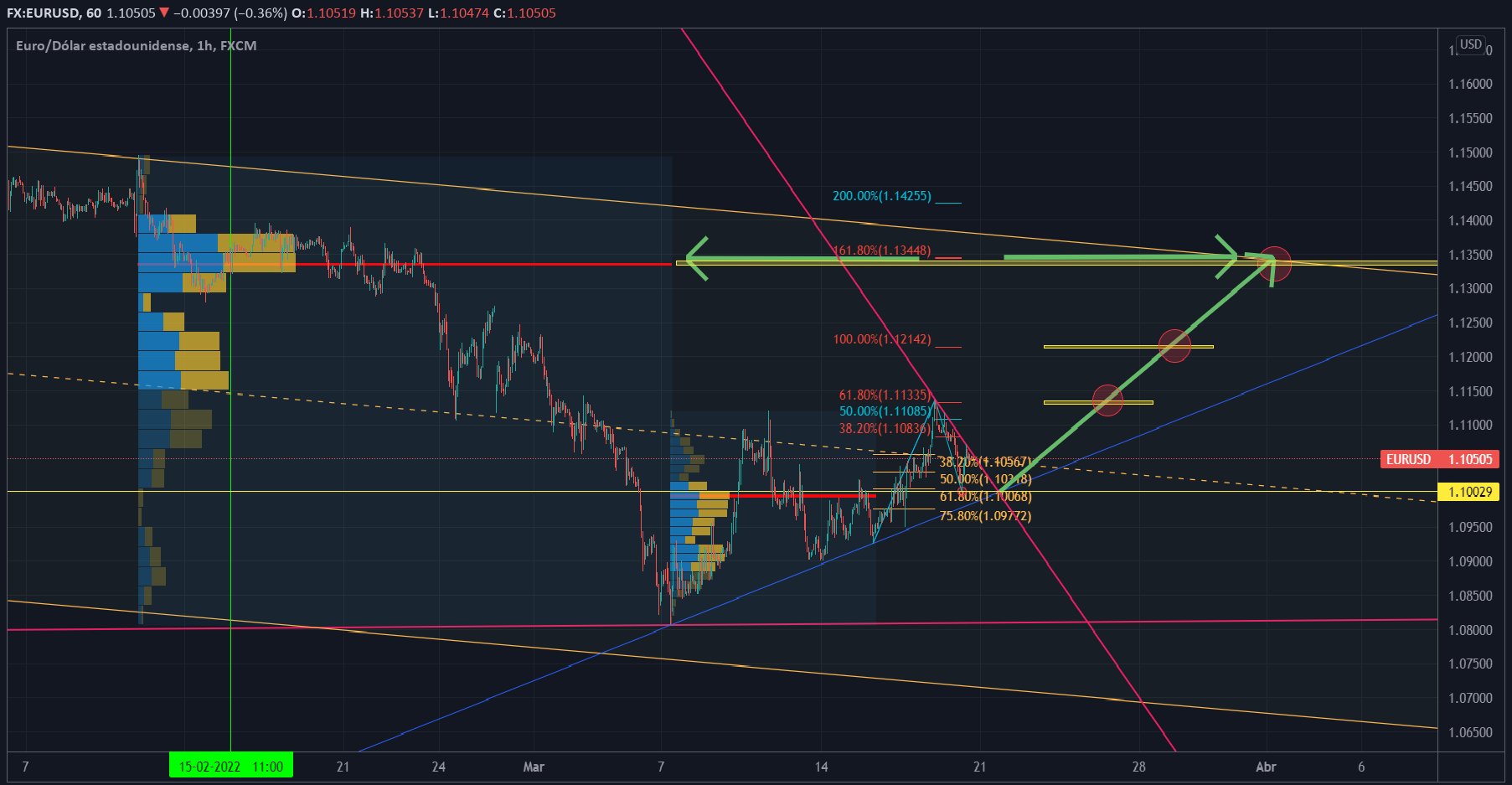 Desde el último rebote técnico en zona 1.10029 hemos observado clúster con POC confirmado, respaldado por el retroceso del 61,8% de Fibonacci, formando un fuerte rechazo a la zona de re-acumulación (pérdida del punto de control), motivos suficientes para concluir su fuerte dirección tendencial alcista, hacia objetivos del 61,8% de la expansión de Fibonacci, como 1er. target (doble techo) se observa la siguiente zona de negociación zona de (re-acumulación) como target 2 en el 100% de la extensión de Fibonacci 1.12144 . Finalmente un posible 3er target en zona 1.13358 encontramos clúster del perfil de volumen + la extensión del 161,8 de Fibonacci haciendo techo con línea contra-tendencial descendente.