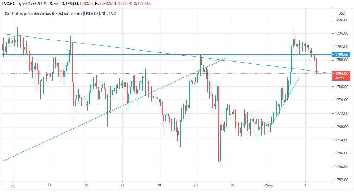 El precio del oro está en una posición importante, en la zona de corrección formada por dos líneas de soporte y resistencia. Esta zona apareció dentro de un canal de tendencia bajista a largo plazo que existe desde el verano de 2020. Permítanme recordarles que después de una fuerte caída a fines de febrero, el precio llegó a la línea de soporte 1675. 40 , el borde inferior de la tendencia bajista. El precio se alejó de esta línea y llegó a la línea de soporte en 1738.30. Sin embargo, no pudo romperlo de inmediato y resolvió el retroceso.