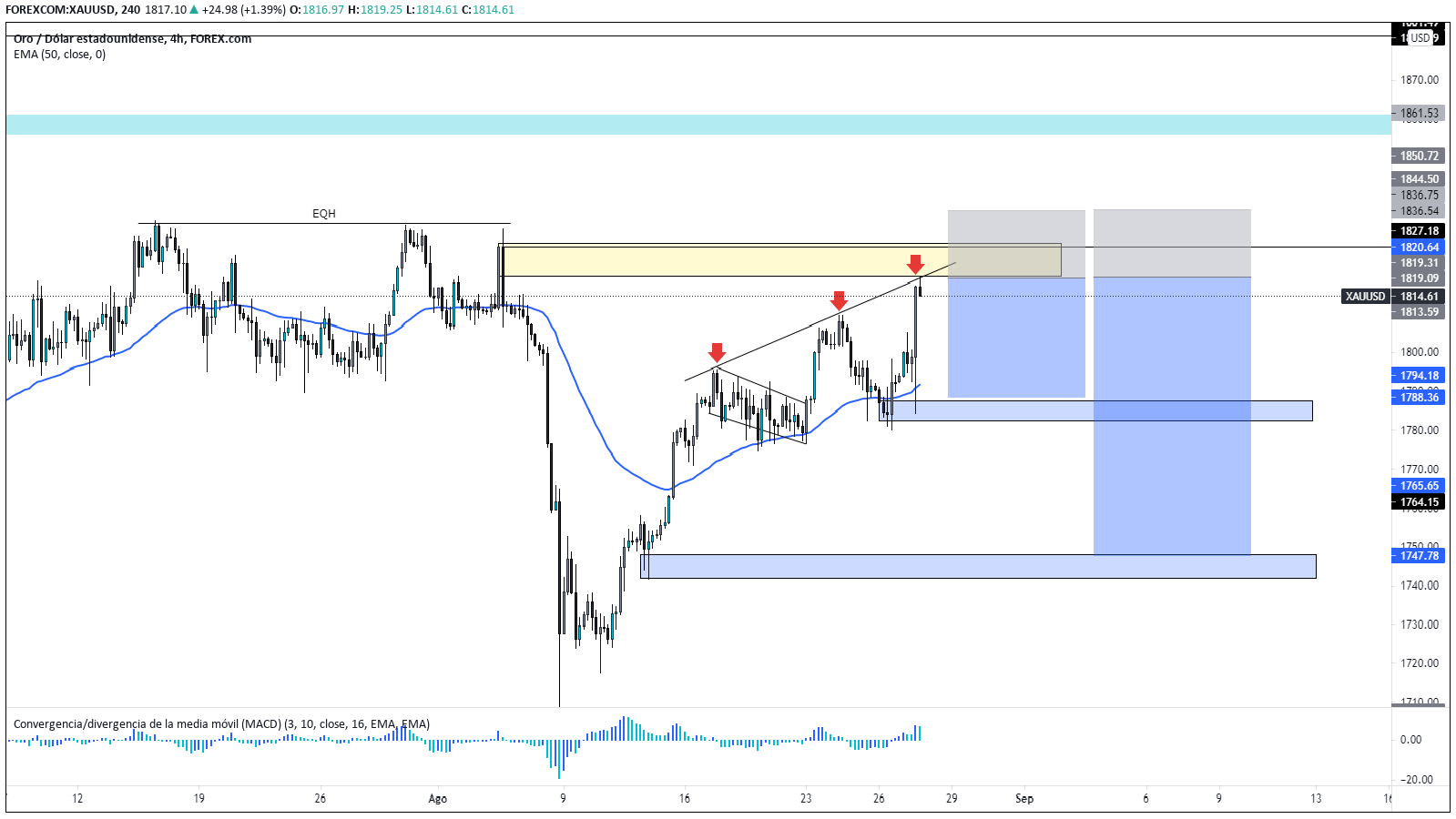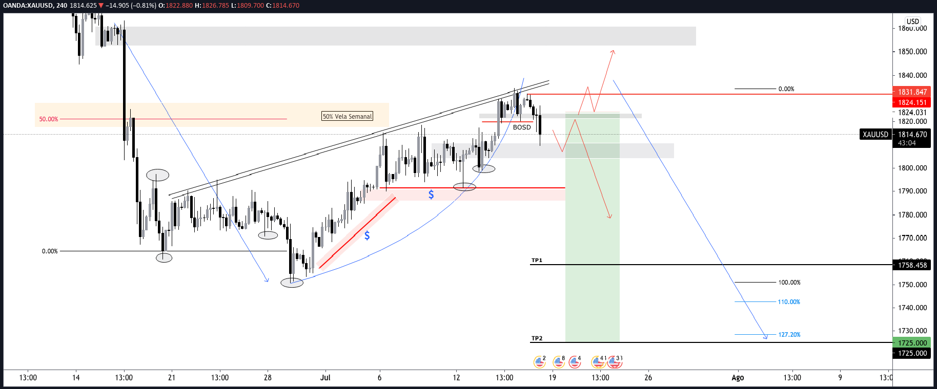 El rango principal es de $ 1922,00 a $ 1677,90. Actualmente, el oro está probando su zona de retroceso en $ 1800.00 a $ 1828.80.