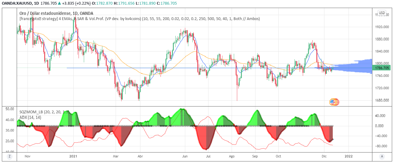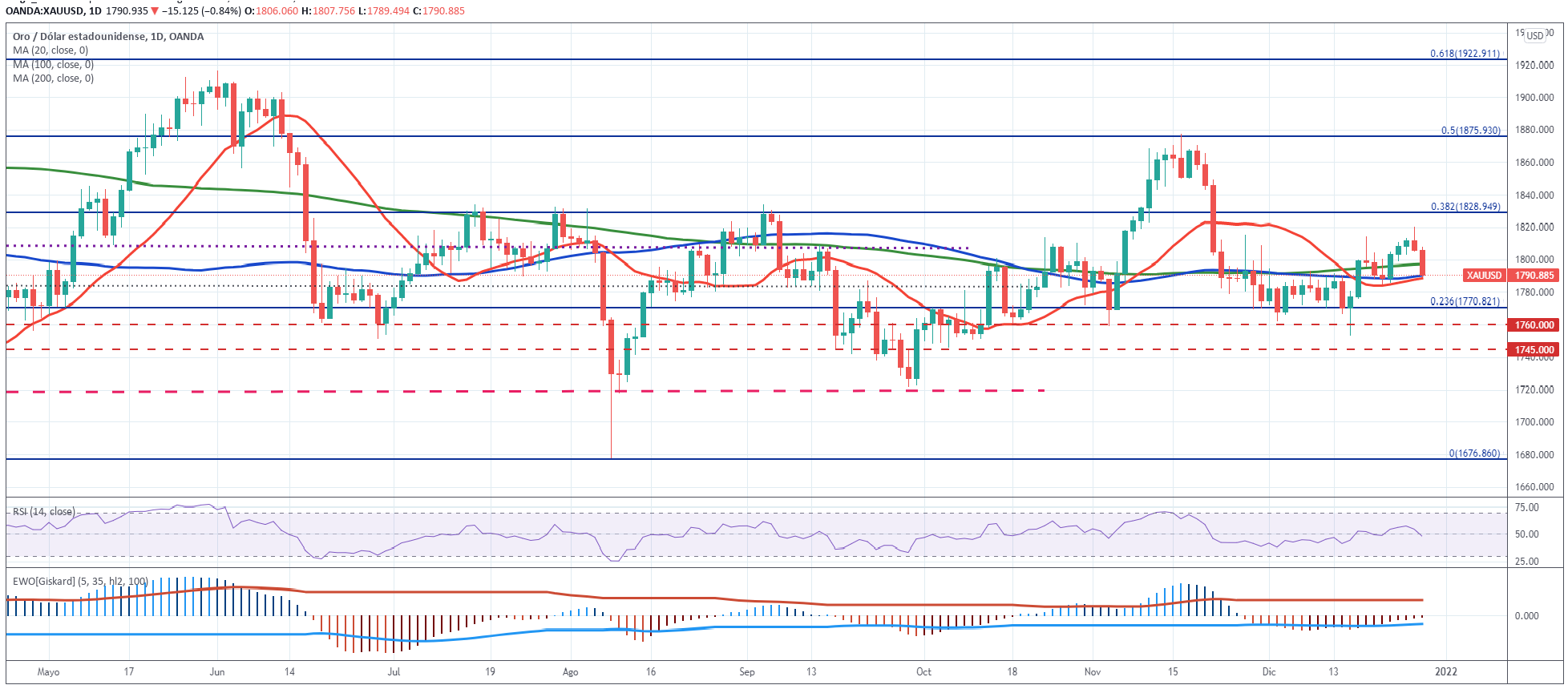 La perspectiva técnica del XAU/USD se muestra ligeramente bajista en el gráfico diario, con los indicadores en territorio negativo, mientras que el precio acaba de cruzar la media de 200 días y cotiza en torno a $1795 la onza.