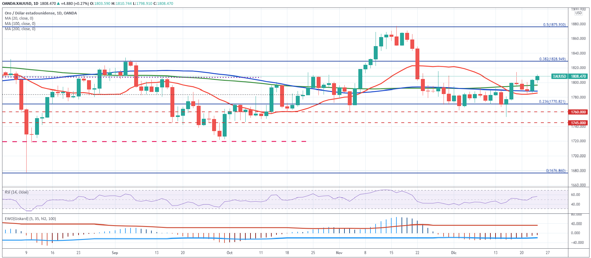 Desde una perspectiva técnica, el sesgo del XAU/USD se ha tornado ligeramente positivo en el gráfico diario aunque el potencial alcista permanecerá limitado por debajo de $1829 la onza, que representa el retroceso de Fibonacci del 38,2% de la caída de agosto 2020 a marzo 2021.