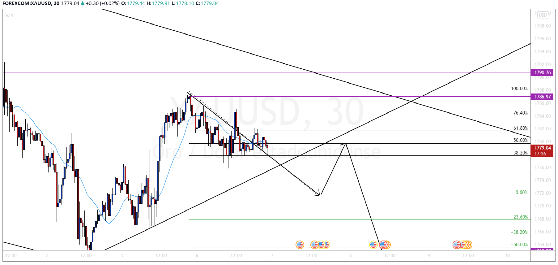 En el lado negativo, el soporte principal es el mínimo de consolidación marcado por la zona azul. El precio está bastante lejos de esa área y no hay catalizadores económicos reales para ese tipo de movimiento hoy, pero existe la lectura del IPC de EE. UU. Al final de la semana. Por el lado positivo, hay más tráfico, la resistencia púrpura también está cerca de la media móvil simple de 200. Más allá de esto, la siguiente zona es el área verde a $ 1816 / oz. El nivel psicológico de $ 1800 / oz también está cerca del precio actual. Esta área podría actuar como una zona de resistencia natural y también debe ser vigilada.