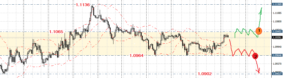 Después de esto, el precio puede revertirse al alza y subir a los máximos cerca de 1,1135. Si el precio atraviesa la banda media de Bollinger, podemos observar que alcanza el nivel de 1,0960.